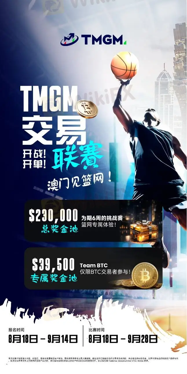 为了增加赛事整体的竞技性和刺激性,TMGM将赛程压缩至六周,赛事的报名时间为2025年8月18日至9月14日,比赛周期从8月18日持续至9月28日。在这段充满机遇的赛期内,交易者将共同角逐高达230,000美元的总奖金池,并且有机会赢取篮球澳门赛门票和免费住宿,亲临现场感受篮球的激情!