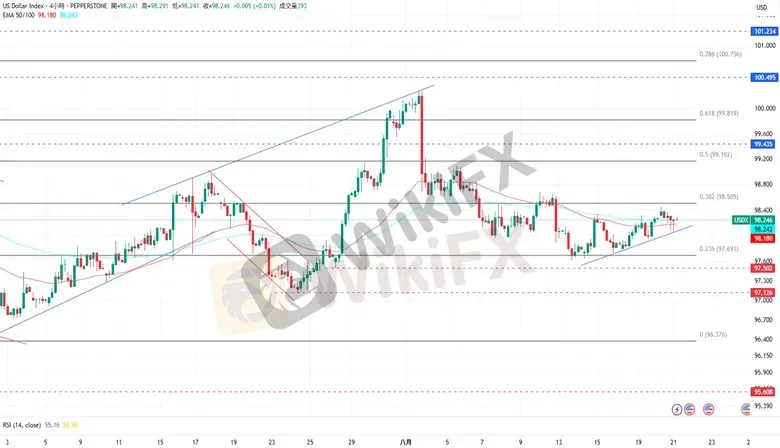 美元指数在回落至上升趋势线的支撑水平后成功反弹并收复当日的跌幅。上涨方面,美元指数接下来的阻力为8月11日的高点98.684,再来是斐波纳契0.5的99.162。下跌方面,若回落至EMA50下方,美元指数目前的支撑为8月19日的低点97.941,接着是8月13日的低点97.620。
