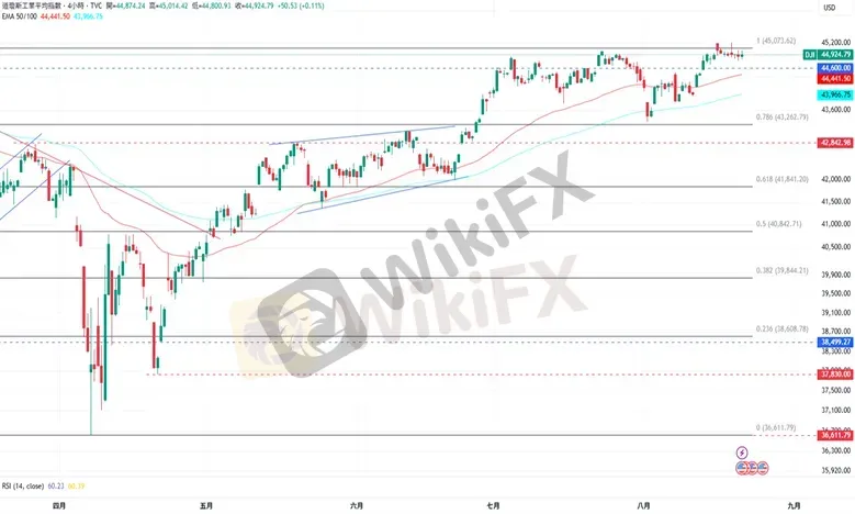 CPT Markets分析师指出,道琼指数继续维持在45000点的关键阻力水平下方波动。上涨方面,若再次突破45000点水平,道琼指数目前的阻力是8月15日的历史新高45202点。下跌方面,道琼指数目前的支撑为8月14日的低点44690点,接着为EMA50均线所在的44441点。