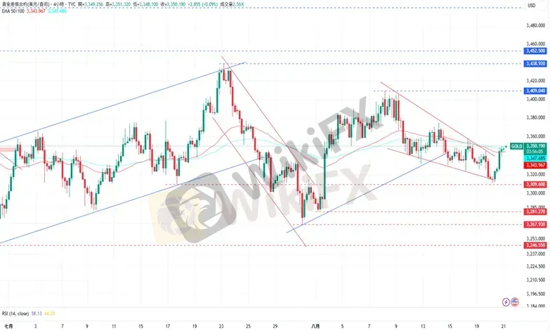 CPT Markets分析师指出,黄金自3311美元的低点反弹,并突破了EMA50均线的压力并维持于上方,同时价格走势在四小时图面上形成下降楔型的反转型态。上涨方面,黄金目前的阻力为8月18日高点3358美元,接着是8月14日的高点3374美元。下跌方面,黄金目前的支撑8月20日的低点3311.25美元,再来是8月1日低点3281美元。