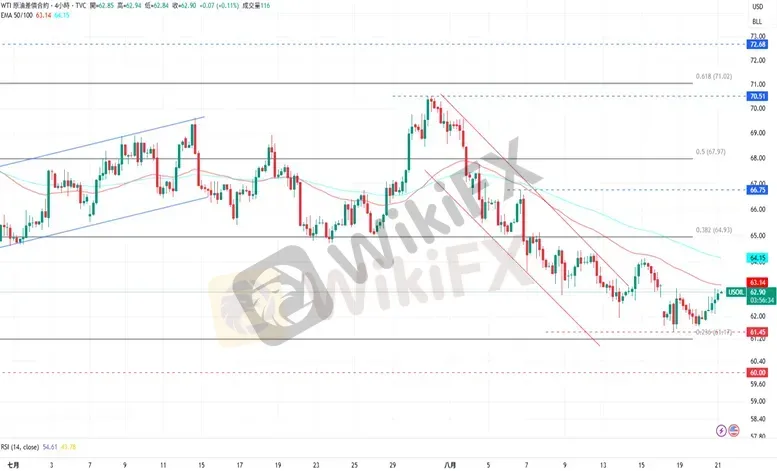 WTI原油自61.65美元回升,并开始测试上方EMA50形成的压力线。上涨方面,若突破EMA50的压力线,WTI原油目前的阻力为8月15日的高点64.15美元,再来是与8月6日的高点66.75美元。下跌方面,原油目前的支撑为8月18日的低点61.45美元,再来是斐波纳契0.236的61.14美元。