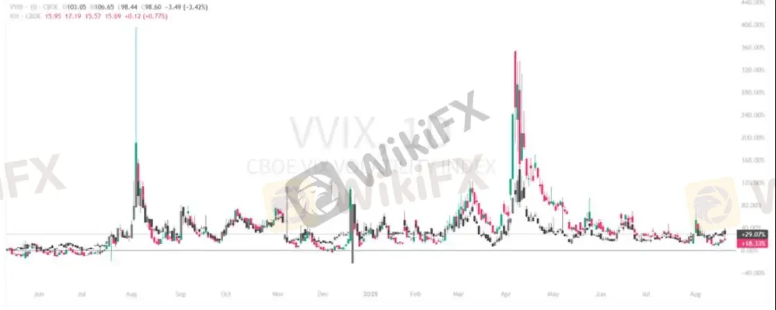 VVIX维持在16附近低档震荡,显示股市短期波动预期有限,而VVIX则自高位持续回落至百点左右,反映期权交易者对波动性的担忧逐步降温。整体来看,市场恐慌情绪较前期大幅收敛。