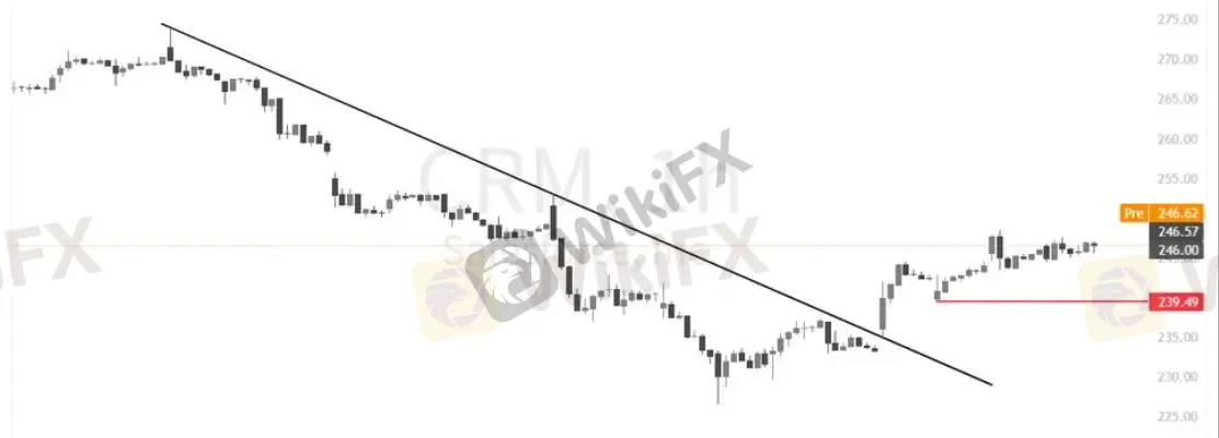 CRM 在经历一波下跌后成功突破下降趋势线,目前股价企稳在 246 美元附近。短期支撑位落在 周一低点 239.5 美元,只要该位置不被跌破,走势维持偏多结构。若能继续站稳 246 美元并放量突破,则上方有望挑战 257 美元压力位。