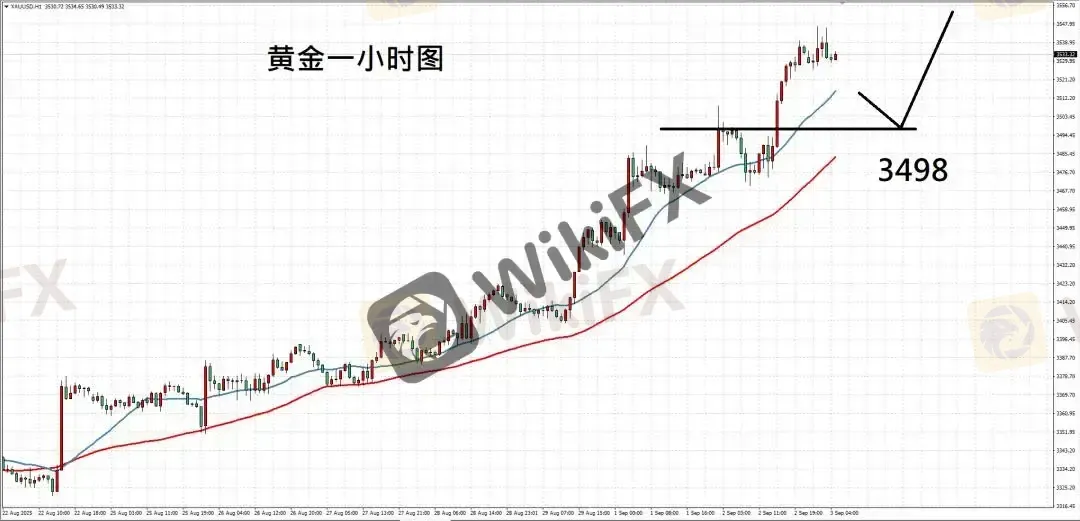 摘要:【基本面分析】昨日美国8月ISM制造业PMI录得48.7,连续6个月处于萎缩区间,就业指数亦低于预期,显示企业招聘意愿疲弱。与此同时,英、法、德长债价格暴跌,凸显市场对政治与财政政策的不安,欧元与英镑急挫,引发资金回流黄金避险,推动金价刷新近期高点。【技术分析】黄金一小时图,走势相对高低点持续上移并刷新近期高点,反应买盘强势;如后续回落未击破前期支撑,则走势或继续向上,故建议短多操作。操作建议:建