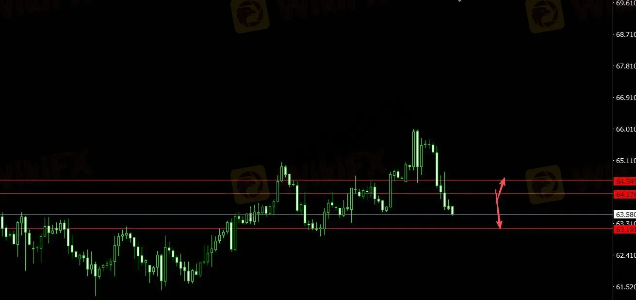 美元指数受支撑,原油承压,关注支撑位63.180,4小时看多至64.550;关注压力位64.180,4小时看空至62.870。