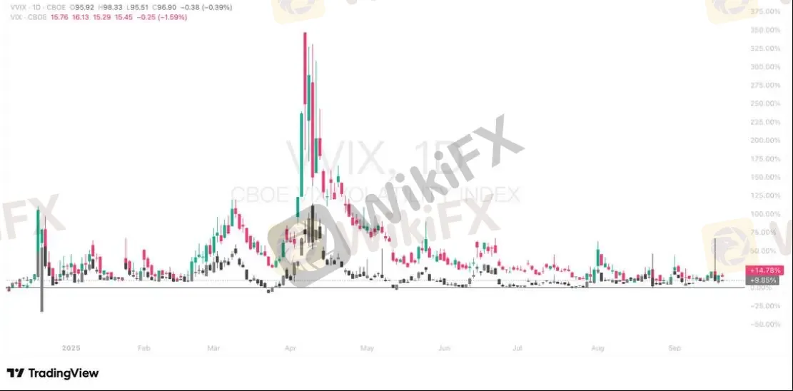 周五,恐慌指数(VIX)和恐慌指数波动率(VVIX)双双出现小幅回调。从市场表现来看,VIX 下跌 1.59%,VVIX 下跌 0.39%。回顾近期走势,此前市场经历了一定的波动,而此次回调或许反映出市场情绪在短期内出现了些许缓和。
