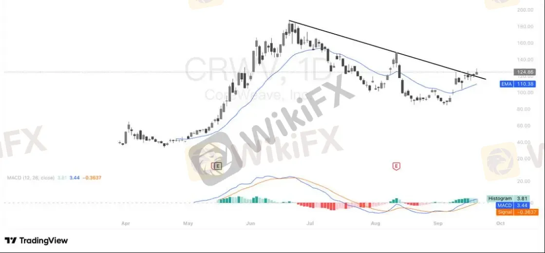 技术面方面,CRWV已突破日线趋势压力位,短期有望进一步打开上行空间。