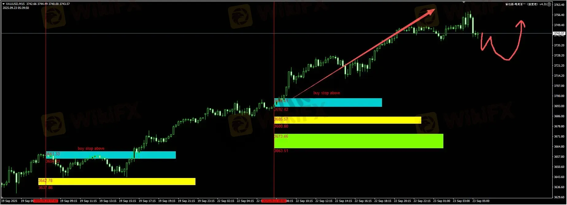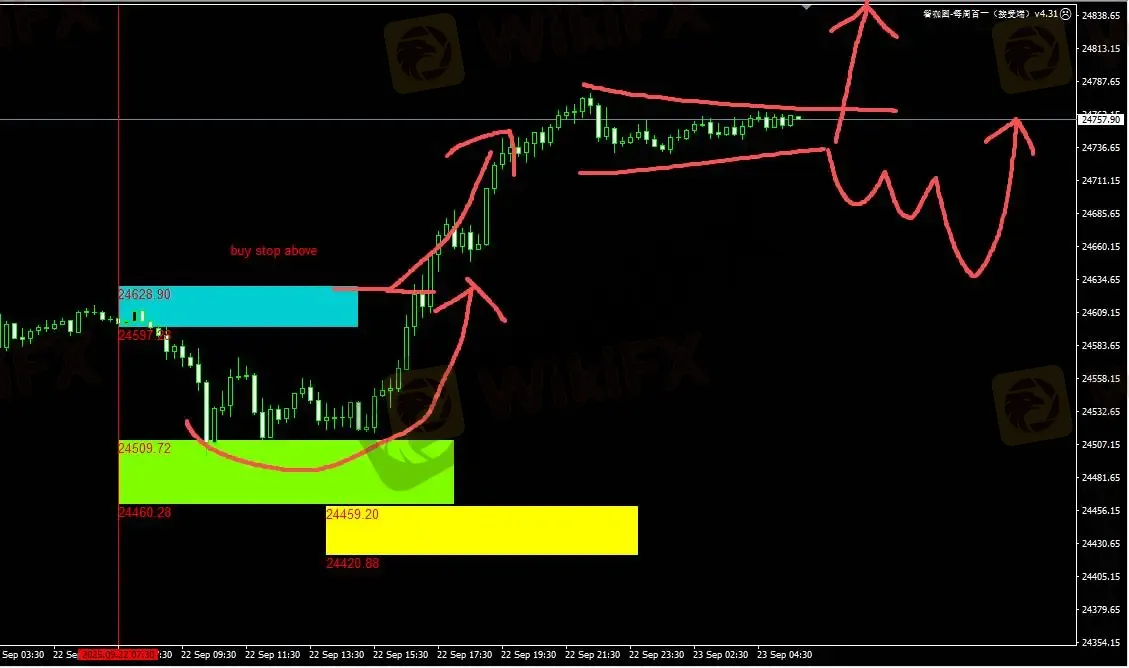 纳指:降息给价格提供了比较有效的支撑,但扫荡流动性的行为每天都在出现。昨天我们插件明确提醒了绿色需求区的buy limit,以及突破蓝色动能区域之后的buy stop,目前这2波操作全中。日内建议减仓推保护,新开仓可以继续关注收敛突破的情况;以及扫荡时段流动性之后的反弹。详细位置请咨询插件。