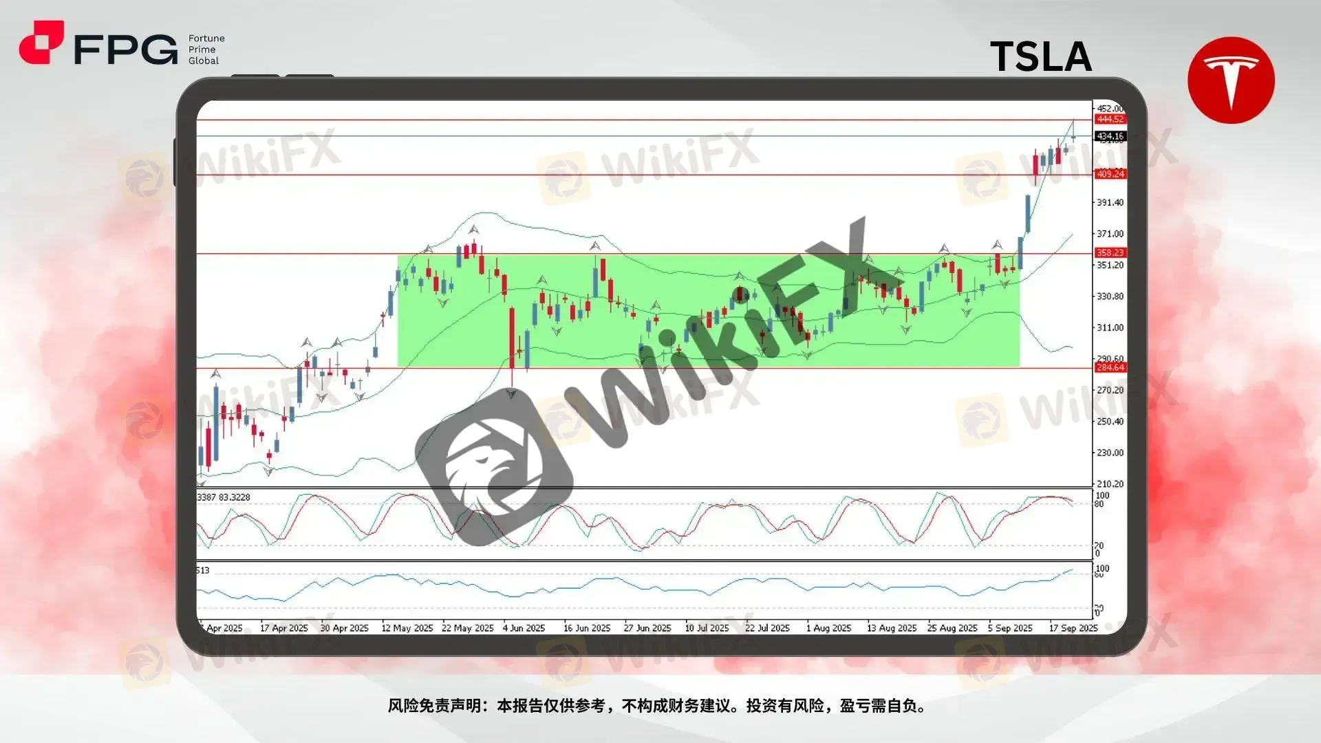 中性情景:若 TSLA 在 434 – 444.52 区间内盘整,短期可能进入横向震荡阶段。交易者应耐心等待明确突破或跌破信号再考虑新仓位。