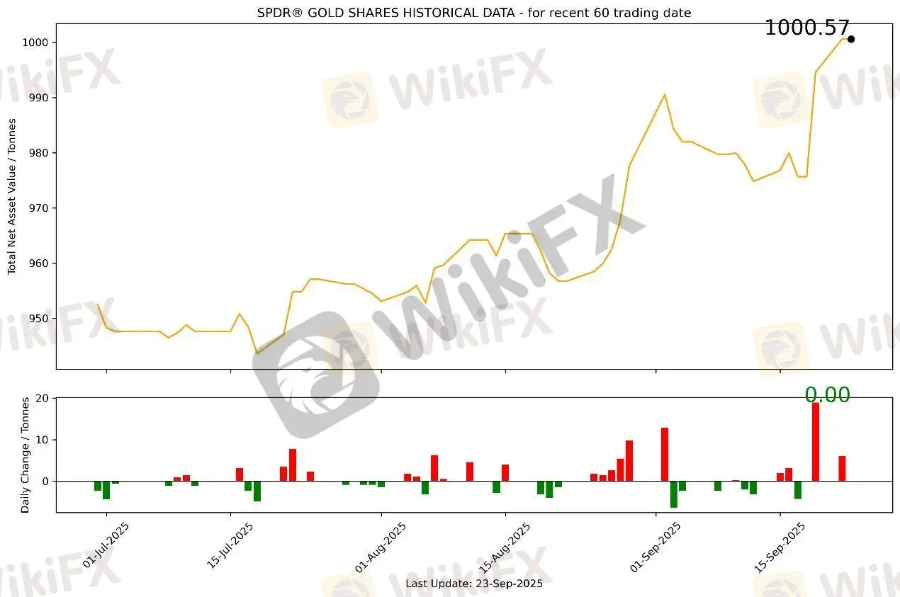 截至9月23日,全球最大的黄金ETF SPDR Gold Trust持仓量为1000.57吨,与上一个交易日持平。9月23日现货黄金自3746美元/盎司开盘后延续前一日涨势,震荡突破3790美元关口,最高向上触及3791.08美元/盎司,多次试探未能有效站稳3790美元。美盘交易时间跌落,最终收于3765.052美元/盎司,涨19.354美元或0.52%。