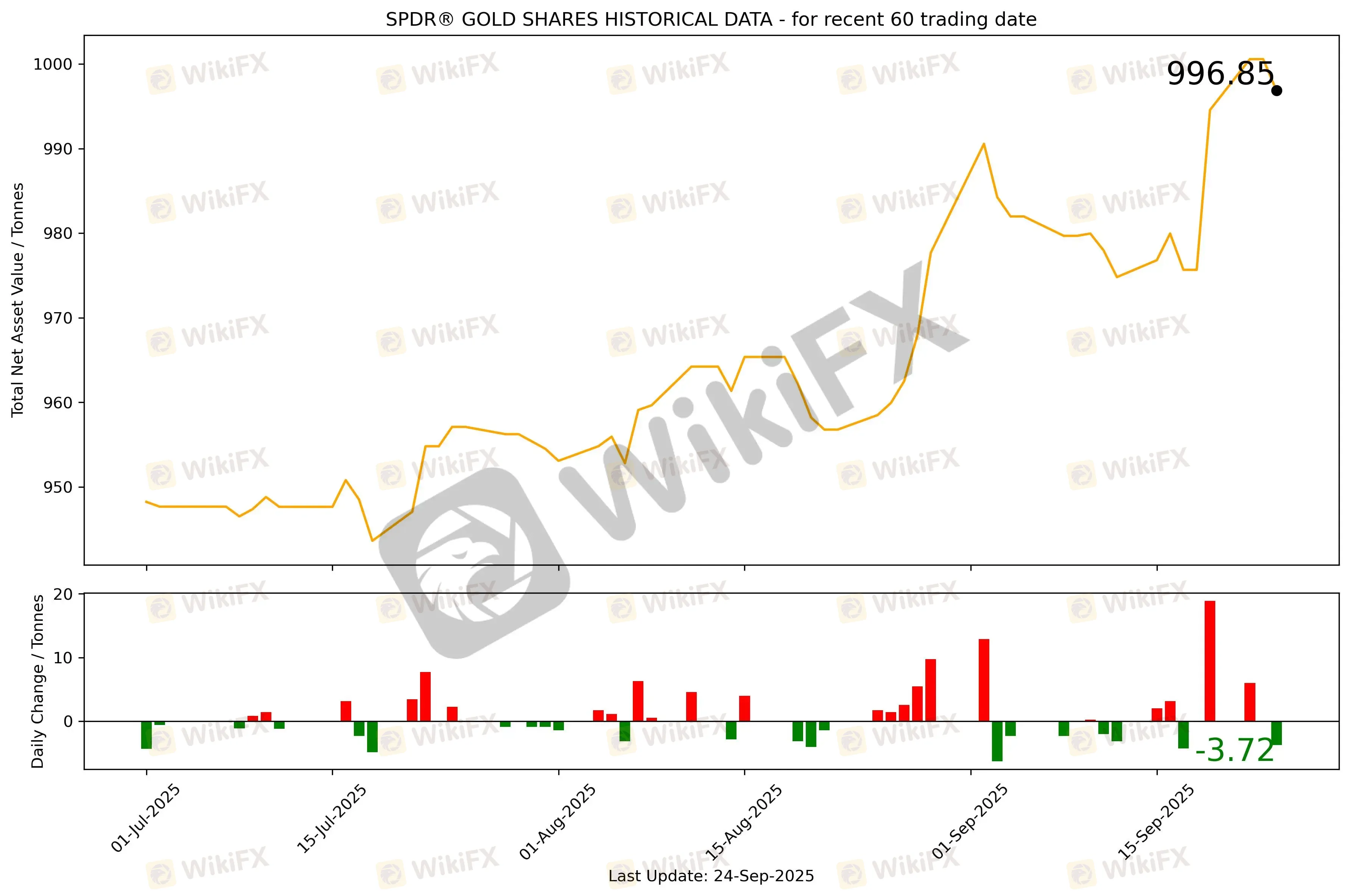 截至9月24日,全球最大的黄金ETF SPDR Gold Trust持仓量为996.85吨,较上一个交易日减少3.72吨。9月24日现货黄金迎来近四日最大跌幅;早盘震荡后逐渐走弱,整体呈现阶梯式下跌,美盘交易时间出现一波明显的快速下挫,最低触及3717.57美元/盎司。随后价格在低位获得支撑,出现技术性反弹,最终收于3735.613美元/盎司,跌29.439美元或0.78%。