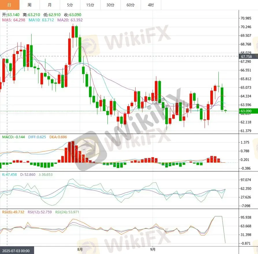 从技术形态观察,WTI原油日线连续两日收阴并跌破短期均线支撑,MACD指标出现死叉迹象,显示市场动能逐步转弱。63美元关口成为关键支撑位,若失守则可能下探61.50美元区域;反弹则需突破65.80-66.20美元压力区间。整体格局偏空背景下,短期或围绕支撑位呈现震荡整理态势。