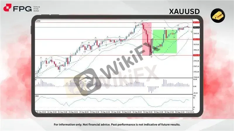 摘要:在创下3,871美元历史新高后,遭遇快速回调,一度跌至3,793美元(红色矩形)。在这波大幅下跌后,买盘力量重新进入市场,推动价格逐步修复,并形成上升趋势线(绿色矩形),目前稳定在3,860美元附近。从技术面来看,布林带(Bollinger Bands)显示,价格自下轨反弹后,现已接近上轨盘整,暗示看涨动能恢复。抛物线指标(Parabolic SAR)已转至价格下方,确认上涨趋势。资金流量指数(M