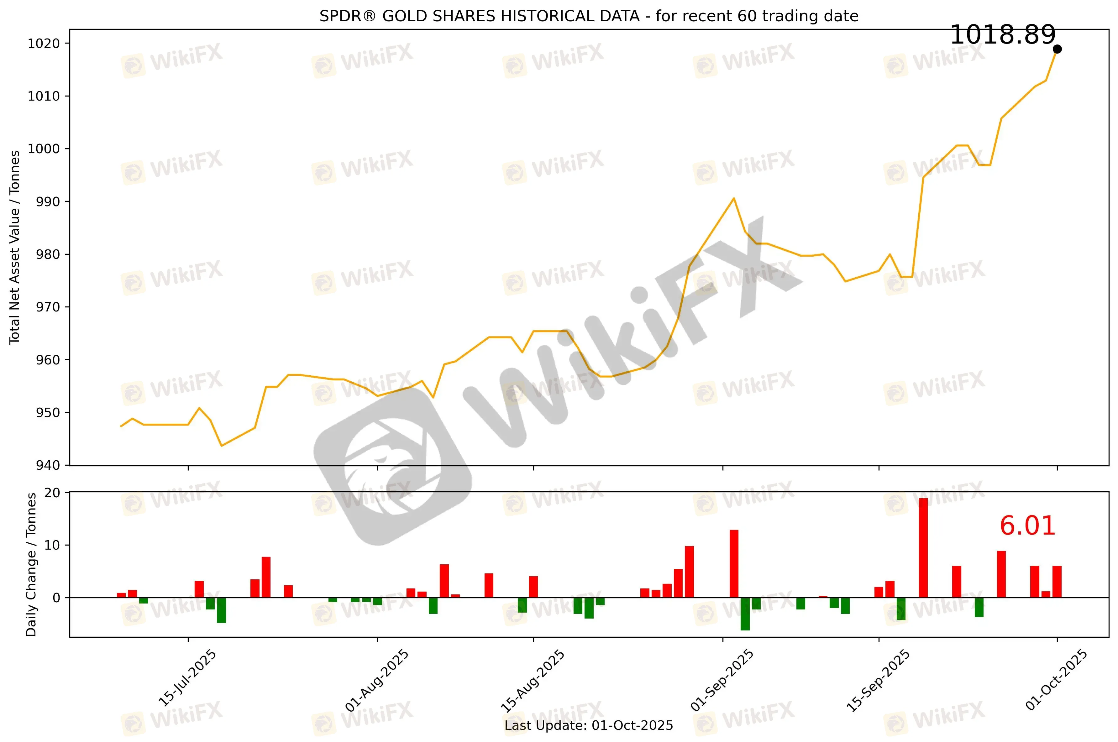 截至10月1日,全球最大的黄金ETF SPDR Gold Trust持仓量为1018.89吨,较上一个交易日增加6.01吨。10月1日现货黄金亚盘开盘3855-3870美元区间震荡,欧盘交易时间出现强劲拉升创新高3895.33美元/盎司,美盘高位承压明显,价格再度回落至中枢3860-3870区域震荡整理。最终收于3865.1美元/盎司,涨6.69美元或0.17%。