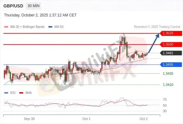 交易策略: 在1.3455之上,看涨,目标价位为1.3500,然后为1.3525。