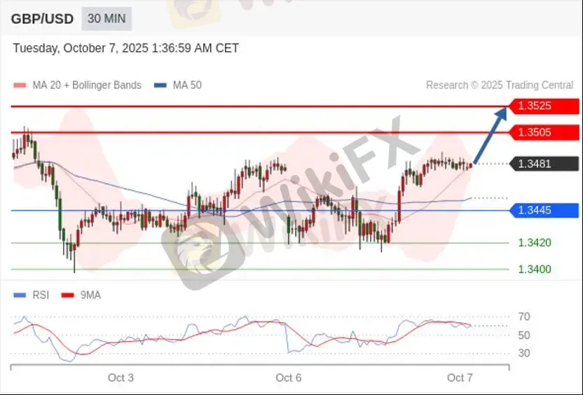 交易策略: 在1.3445之上,看涨,目标价位为1.3505,然后为1.3525。