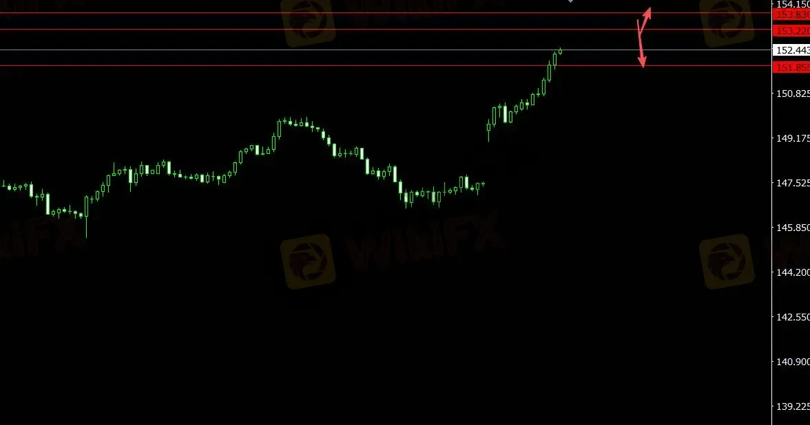 美元指数受支撑,日元上涨,关注支撑位151.860,4小时看多至153.830;关注压力位153.220,4小时看空至151.110。