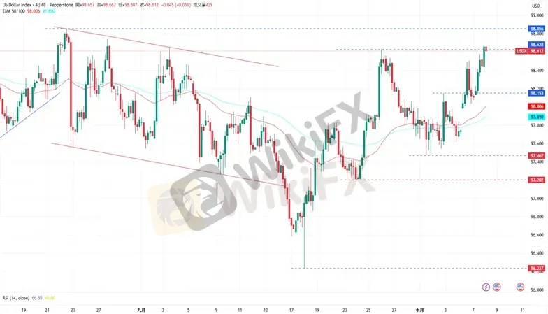 CPT Markets分析师指出,美元指数突破了98.628的阻力水平,同时RSI指标来到68水平,须注意进入超买水平后回落的可能。上涨方面,美元指数目前的阻力为822月22日的高点98.856,再来是8月5日的高点99.093。下跌方面,美元指数目前的支撑为10月6日的低点98.036,接着是10月03日的低点97.617。