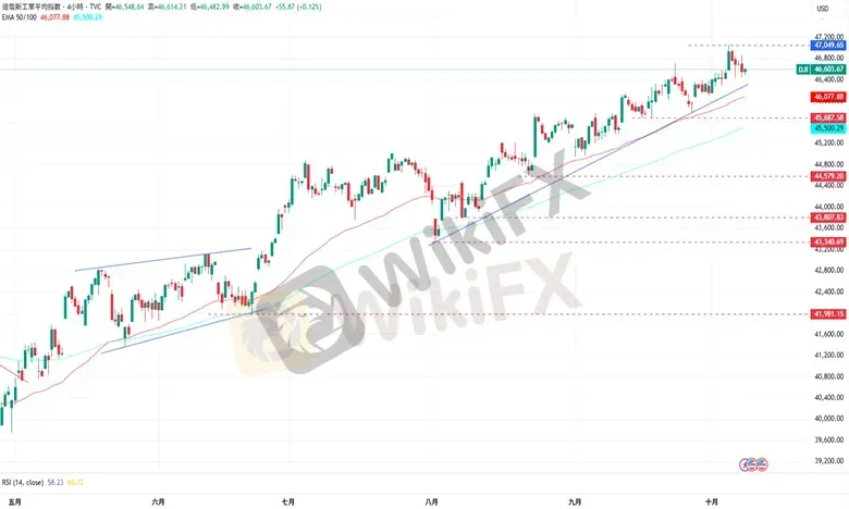道琼指数继续远离47049点的历史高点,并依靠在46400点水平上方盘整。上涨方面,道琼指数目前的阻力为10月3日高点47049点,再来是47500点水平。下跌方面,道琼指数接下来的支撑为10月6日低点46426点,接着为EMA50所在的46077点。