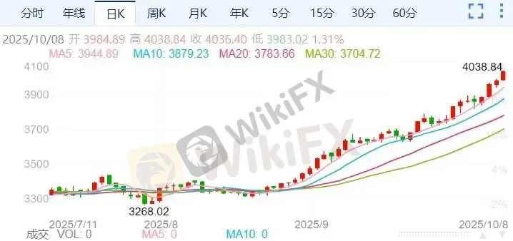 截至2025年10月8日,国际黄金现货价格已突破4000美元/盎司关口,最新报价为4024.90美元/盎司,日内涨幅达40.56美元。短期来看,金价受美联储10月降息预期(概率接近95%)、美国政府停摆风险及地缘政治紧张等因素支撑,多头动能强劲,目标价指向4100-4200美元区间。