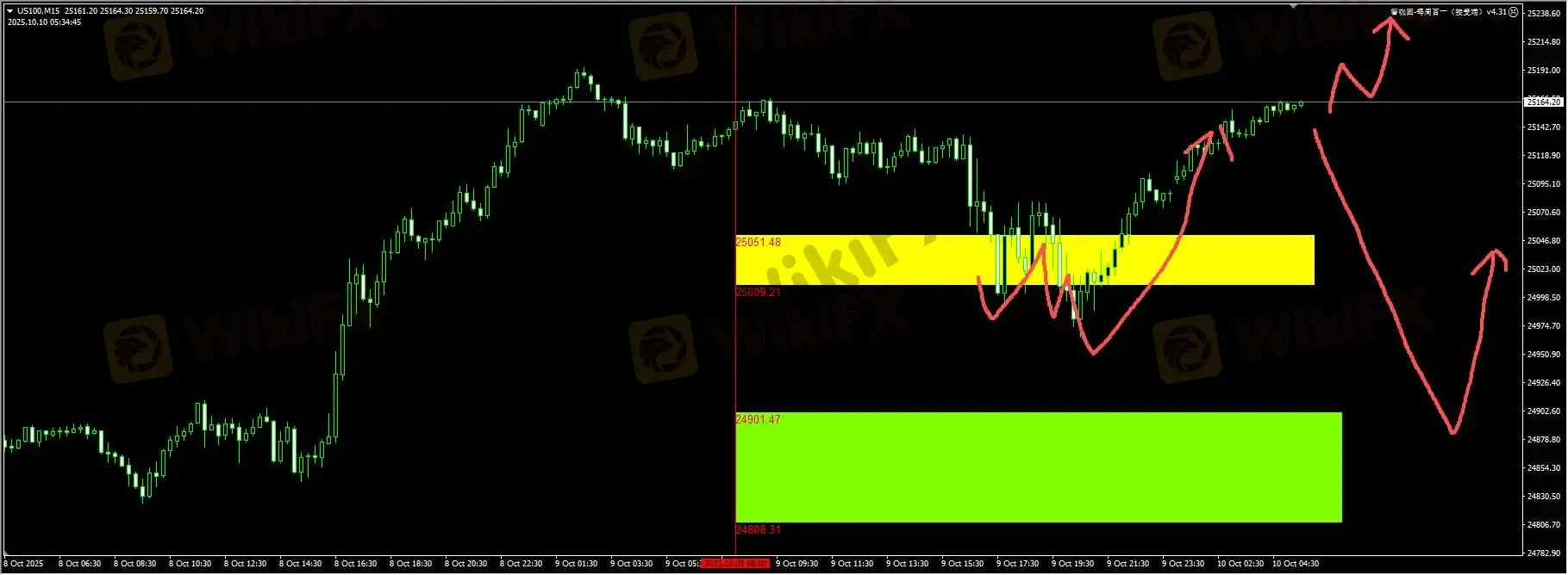 纳指:昨天插件刷新黄色区域流动性之后,开展了反弹走势。日内保持高低配的策略组合。下方绿色低买策略保持挂单,上方突破25200之后,考虑动能突破的多头信号。详细位置请咨询插件。