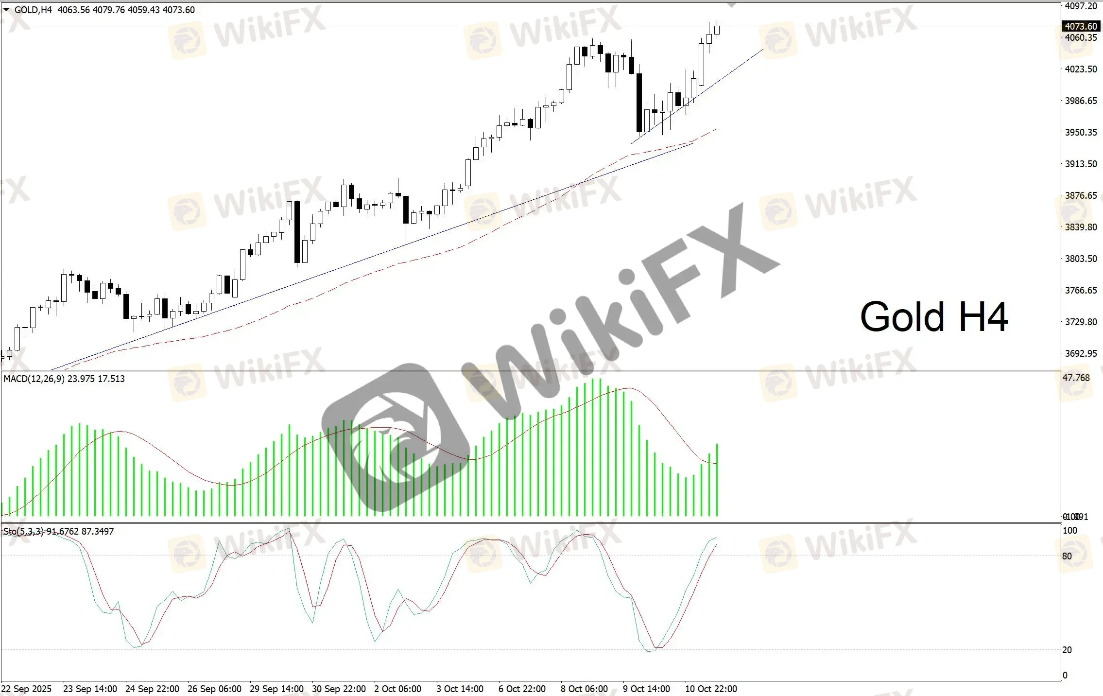 由于4小时图中MACD上升动能柱正有力放大,随机指数进入超买区域后正逐渐失去上升动能,因此预计后市金价将在4060-4080的区间波动,如突破区间上方4090/4100,如跌破下方看4050/4040。