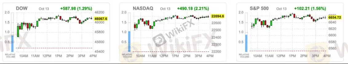 摘要:大盘回顾特朗普释出缓和信号,美股强势反弹美股周一全面反弹,三大指数强势收高,道指涨1.29%,标普500涨1.56%,纳指大涨2.21%。此前特朗普对中美贸易关系释放缓和信号,称愿与北京磋商以平息紧张局势,市场避险情绪显著降温。同时,中国金龙指数涨超3%,显示投资者风险偏好回升。政策与宏观动向白宫官员密集释出善意,表示“100%关税并非必然”,并确认APEC峰会会晤如期进行。特朗普在中东访问期间,