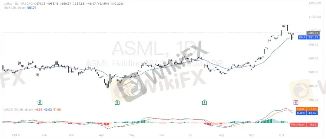 从技术图表来看,ASML 的股价近期呈现出一定的波动。当前股价为 984.66 美元,20 日指数移动平均线(EMA)为 951.74 美元,股价位于均线之上,显示短期多头力量占据优势。结合即将发布的财报,若财报数据符合或超出市场预期,有望推动股价突破前期高点。