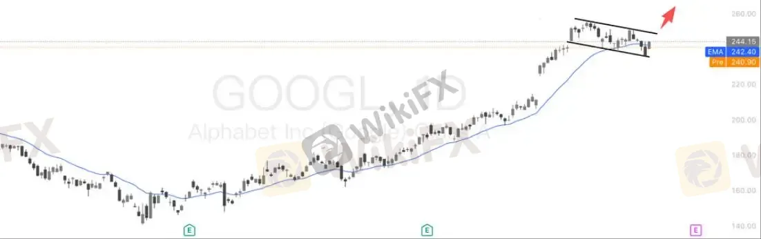 从技术面看,Alphabet(GOOGL)股价近期在高位形成震荡整理的楔形形态,当前股价 244.15 美元,站在 20 日 EMA(242.40 美元)上方,后续需关注能否有效突破楔形上沿,若不能,可能面临回调压力。