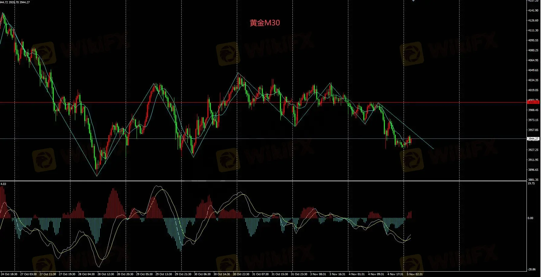 M30图表金价目前为空头走势,当前为下跌笔延续中,短期持续看空,上方压制位4000,下方目标为3900。