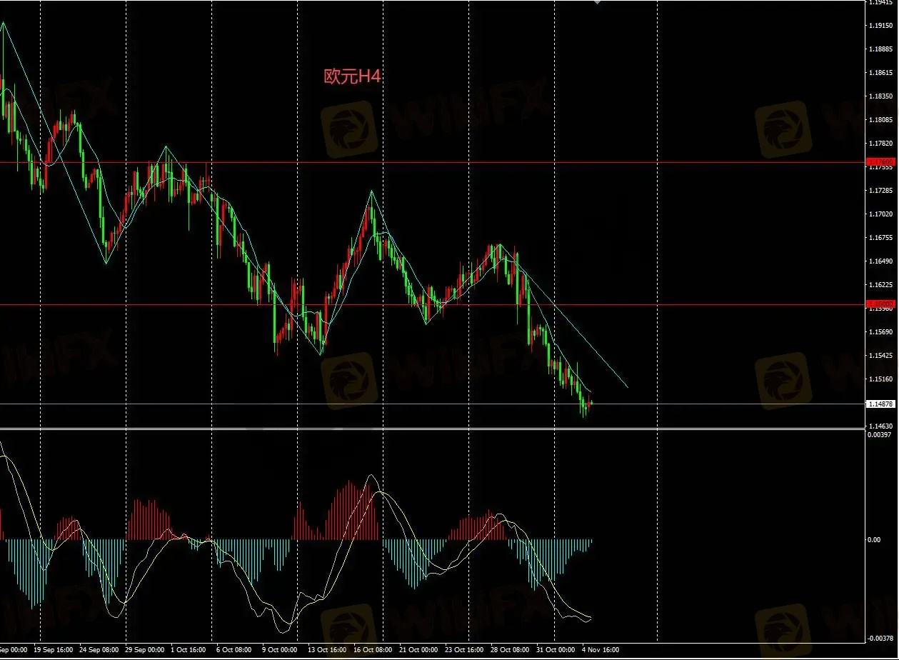 欧元H4价格失守1.16重要关口后持续下破1.15,当前为H4的下跌笔延续,当前持续看空。