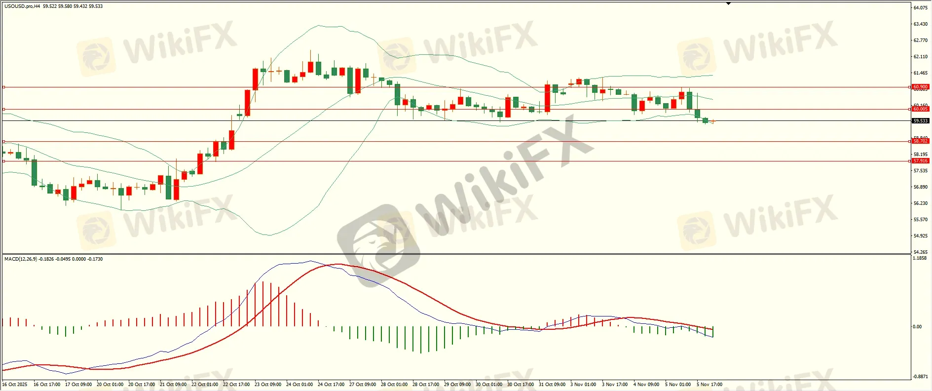 原油昨日反弹至第一阻力上方承压下行,日线报收中阴线,收盘位置触及日线布林中轨,失守后方可继续,从4H来看,布林中轨拐头向下,MACD零轴附近运行,日内上方首要阻力60.00-10,第二阻力60.90,下方支撑58.70,57.90,保持在第一阻力下方短线有望测试第一支撑。