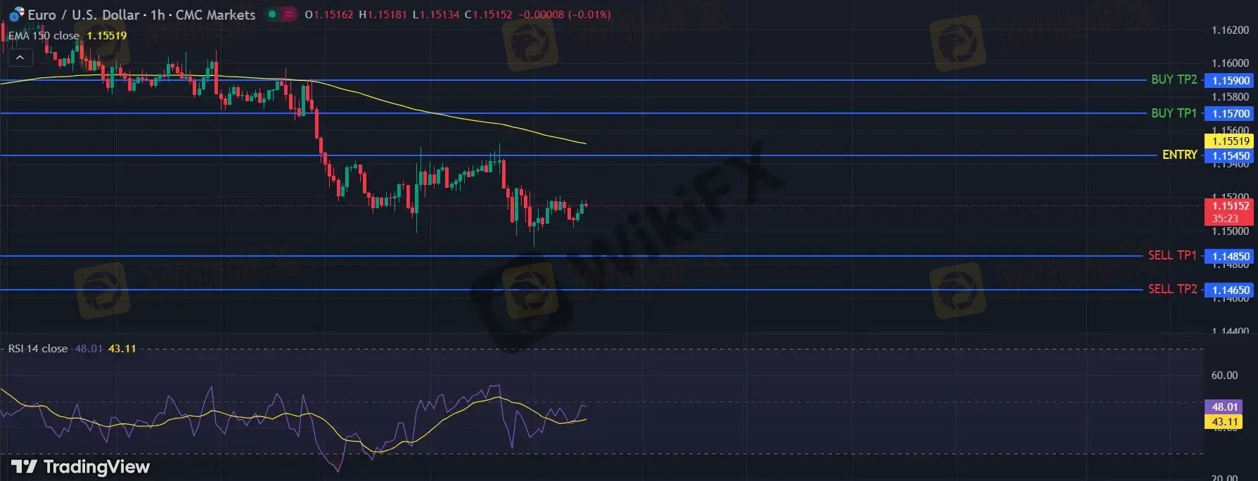 只要依旧存在1.1545阻力位,很可能下跌至1.1485。