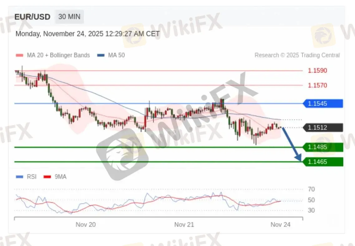 只要依旧存在1.1545阻力位,很可能下跌至1.1485。