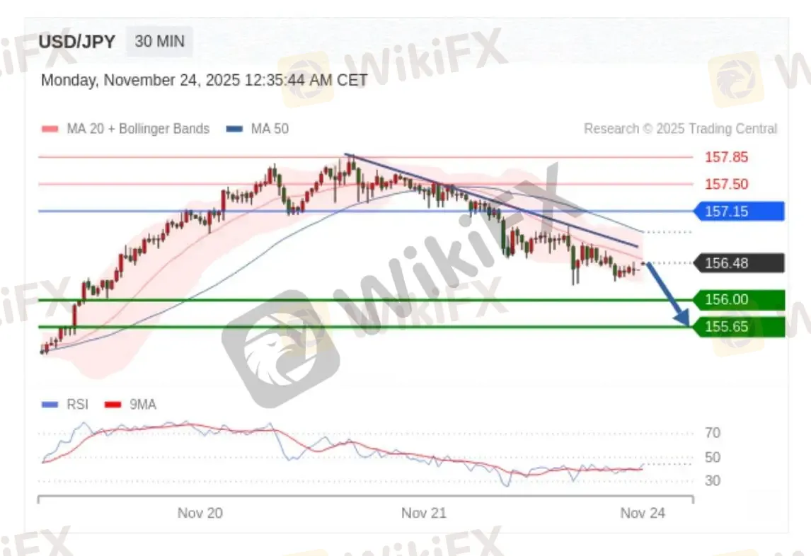 只要依旧存在157.15阻力位,期待回归至156.00。