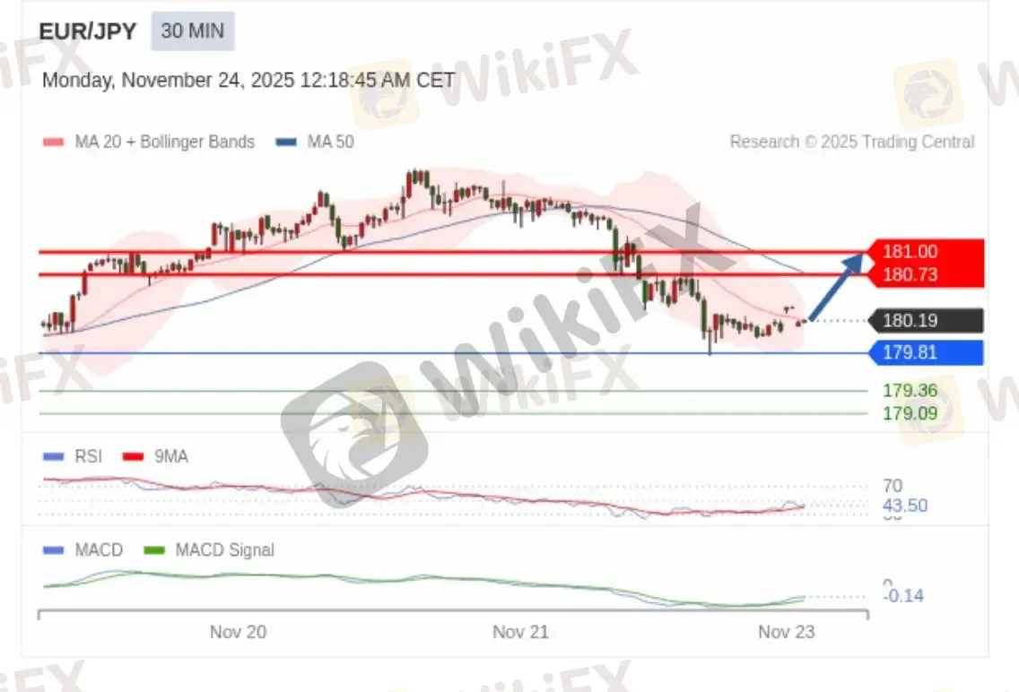 欧元/日元 当日内 : 有上涨的可能,目标价位定在 181.00 。