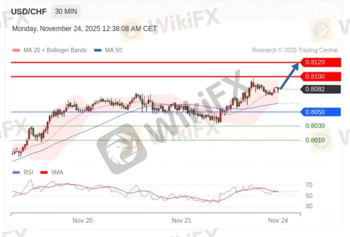 在 0.8050 之上,看涨,目标价位为 0.8100 ,然后为 0.8120 。