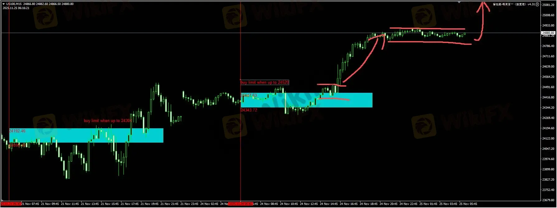 纳指:昨天我们插件提醒的蓝色区域突破之后,没有完成预期之中的回踩走势,原因是价格在24500附近已经形成了新的需求区域。日内由于价格走势区域窄幅波动,我们优先观察动能突破的表现。详细位置请咨询插件。
