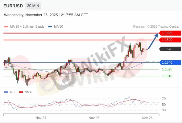 在 1.1540 之上,看涨,目标价位为 1.1590 ,然后为 1.1605 。