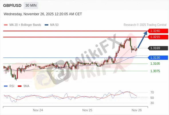 在 1.3130 之上,看涨,目标价位为 1.3215 ,然后为 1.3240 。