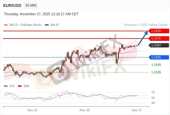 在 1.1565 之上,看涨,目标价位为 1.1615 ,然后为 1.1635 。