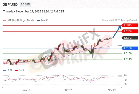 在 1.3180 之上,看涨,目标价位为 1.3280 ,然后为 1.3315 。