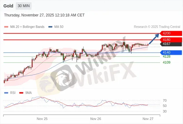 在 4140 之上,看涨,目标价位为 4180 ,然后为 4200 。