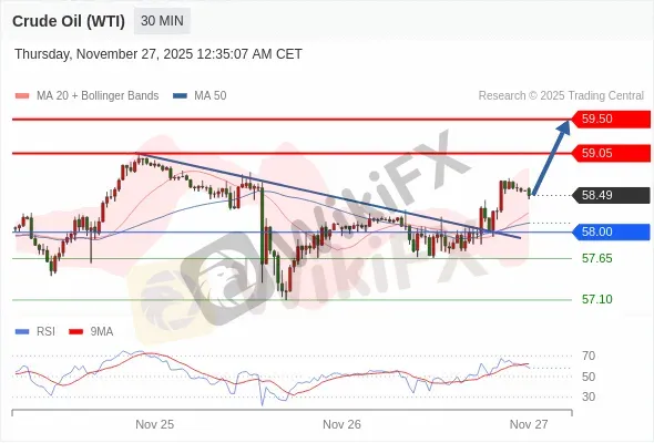 在 58.00 之上,看涨,目标价位为 59.05 ,然后为 59.50 。