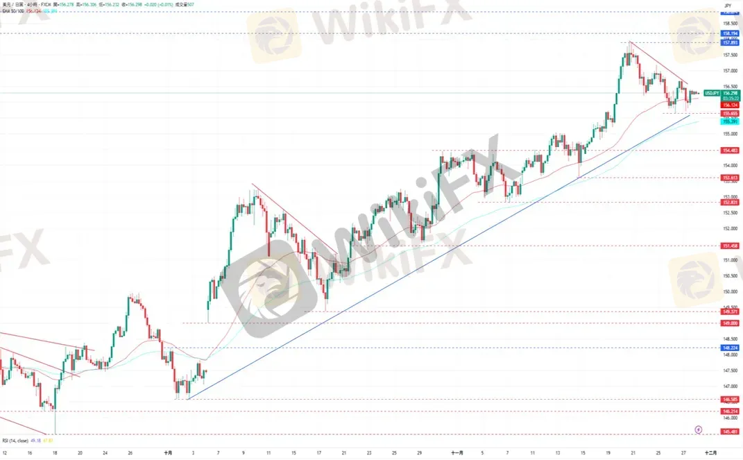 摘要:美元/日币(USDJPY):新闻事件:周四,美元/日元下跌至156.278日元。日本方面,日本央行委员野口旭发表中性言论,削弱市场对升息的预期。野口旭表示,如果经济与物价表现持续符合日本央行目前的展望,央行将开始逐步收紧货币宽松政策,他同时补充央行在判断升息时机时将格外谨慎,确保既不会过早也不会过晚。美国方面,由于此前纽约联储主席威廉姆斯释出「12月仍存降息空间」的鸽派信号,加上感恩节前夕公布的经