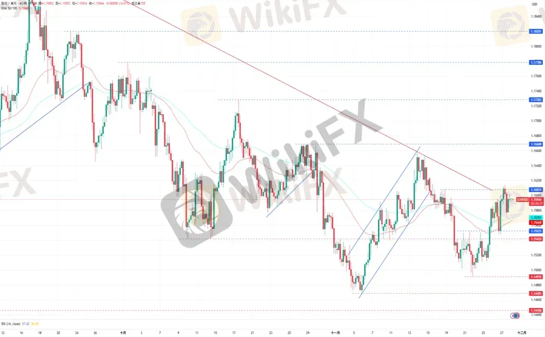 欧元/美元保持在EMA50均线上方波动,并持续测试1.1600的阻力水平。上涨方面,欧元/美元目前的阻力为11月18日的高点1.16078,再来是11月13日的高点1.16560。下跌方面,欧元/美元目前的支撑为11月26日的低点1.15470,再来是11月21日的低点1.14910。