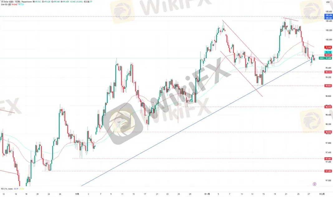 美元指数保持在上升趋势线的支撑区域附近徘徊,以消化RSI指针的超卖讯号。下跌方面,美元指数目前的支撑为11月27日的低点99.438,接着是11月14日的低点99.023。上涨方面,美元指数目前的阻力为EMA50均线所在的99.840水平,再来是11月20日的高点100.463。