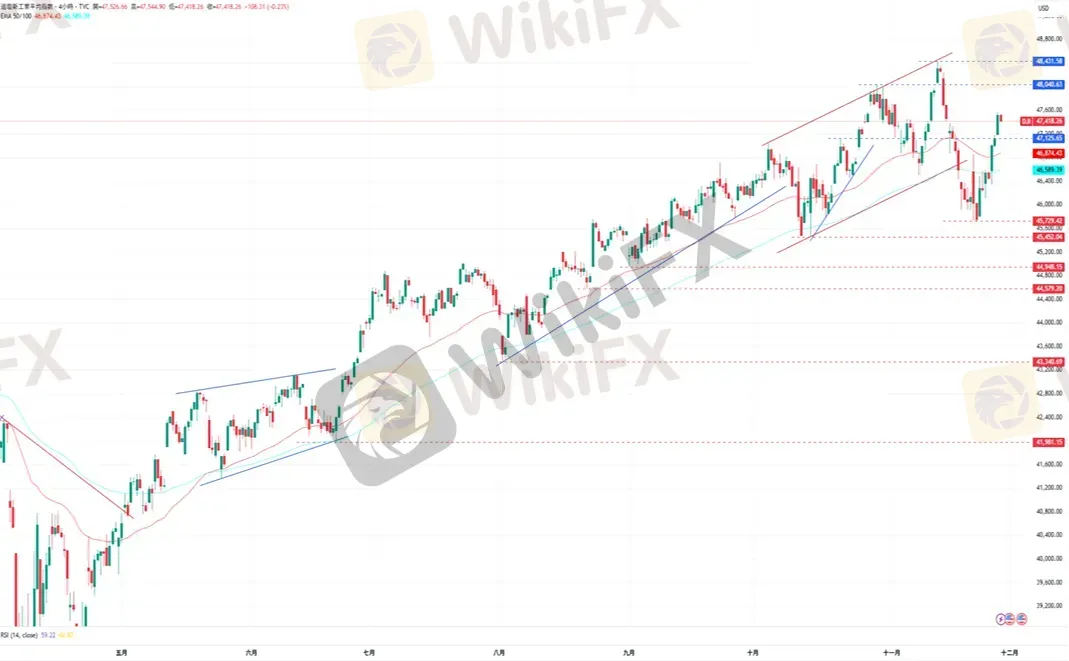 CPT Markets分析师指出,道琼指数持续反弹,并尝试维持在47500点水平上涨方面,若能保持在EMA50上方,道琼指数目前的阻力为11月6日的高点47571点,再来是48000点水平与11月12日的历史高点48431点。下跌方面,道琼指数目前的支撑为EMA50均线所在的46874点水平,接着为11月21日低点45729点。