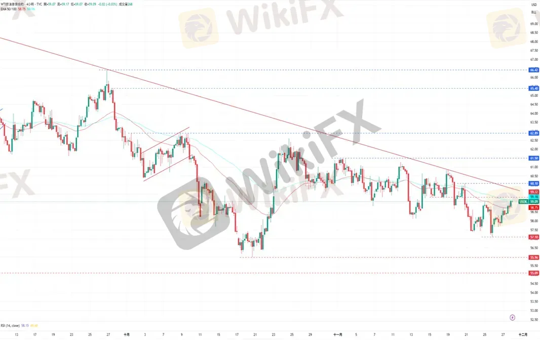 WTI原油突破了EMA50均线,同时由于在价格底部形成双底,有机会进一步上涨。下跌方面,WTI原油目前的支撑为11月25日的低点57.10美元,再来是10月20日的低点55.96美元。上涨方面,若能保持于EMA50上方,WTI原油目前的阻力为11月20日的高点60.10美元,再来为11月03日的高点61.50美元。