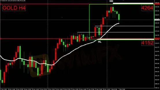 II. 四小时图:高位出现承压迹象。20EMA均线:4200;支撑区域:4200-4210;阻力区域4225-4265。若价格有效跌破20EMA均线,则需警惕行情可能开启更深层次的回调,此时建议保持观望。应等待价格重新收复失地,并确认持稳于20EMA均线之上后,再做进一步的交易决策。
